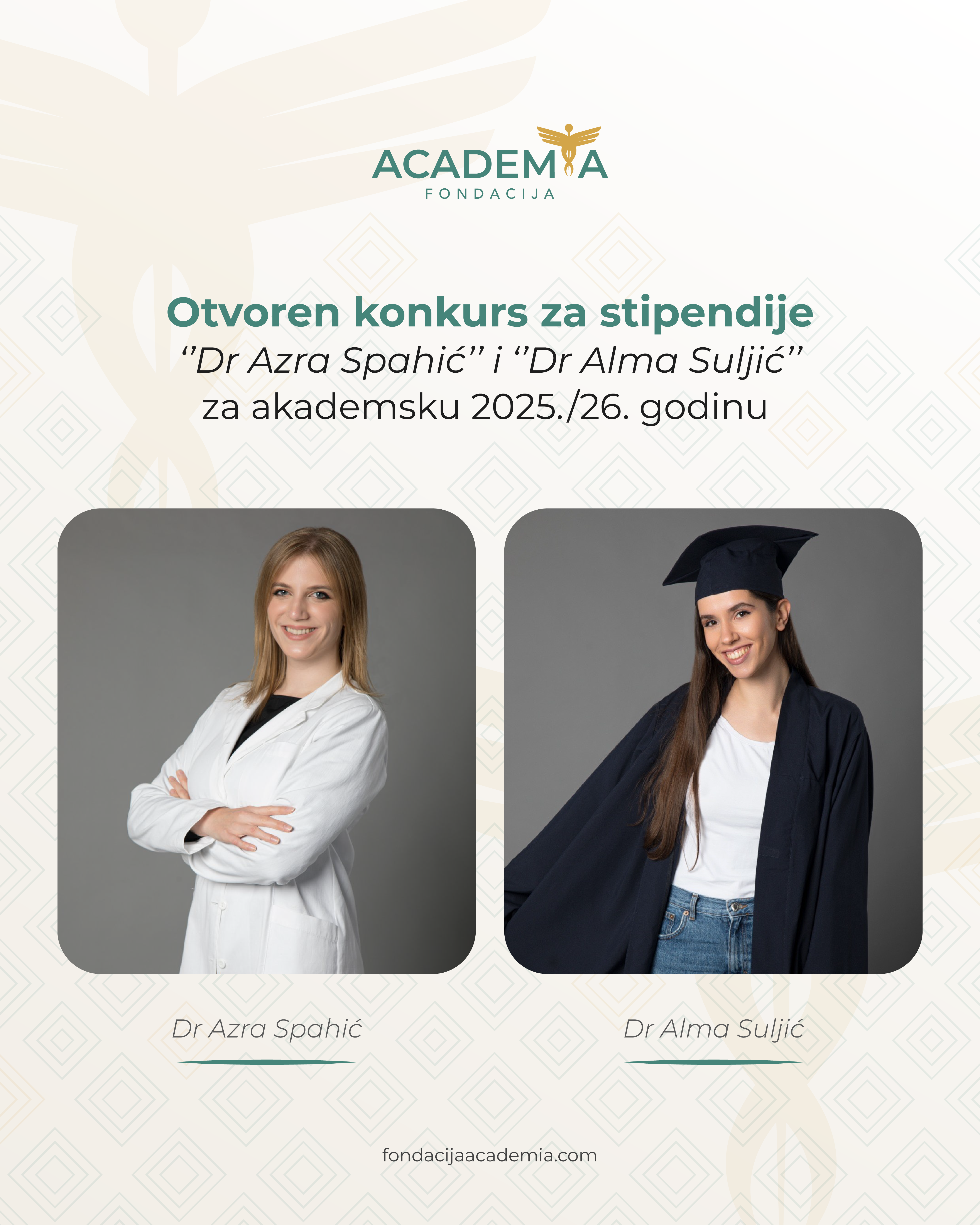 Fondacija Academia raspisuje Konkurs za dodjelu stipendija „Dr. Azra Spahić“ i „Dr. Alma Suljić“, namijenjenih akademski uspješnim studenticama medicine za akademsku 2025/2026. godinu.